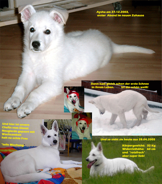 Hier unsere Emily Aysha von Maya Tuk, geboren am 31.10.2003 bei Familie Fellmende in 55263 Wackernheim bei Mainz. Am 27.12.2003 durfte sie dann endlich zu uns, das hieß aber auch Abschied nehmen von Mama (Dale Ronja v. Burg Drachenfels) und Zieh-Papa (Itonka-Paig v. Bella Luna), so wie der ganz tollen Familie des Züchters Wolfgang Fellmende (von Maya Tuk). Der richtige Papa (Zuchtrüde) ist (Icing Sugar vom Werntal)